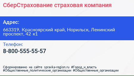 СберСтрахование, страховая компания по адресу 663319, Красноярский край, Норильск, Ленинский проспект, 42 к1 в дальнейшем Организация, размещена в следующих категориях: