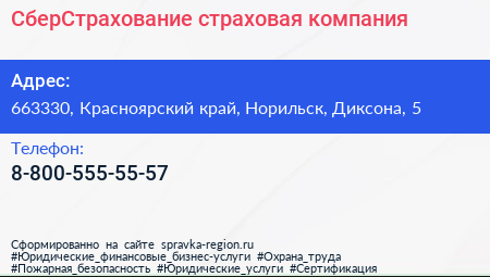 СберСтрахование, страховая компания по адресу 663330, Красноярский край, Норильск, Диксона, 5 в дальнейшем Организация, размещена в следующих категориях: