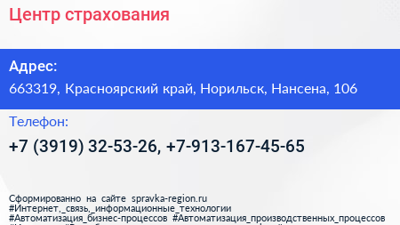 Центр страхования по адресу 663319, Красноярский край, Норильск, Нансена, 106 в дальнейшем Организация, размещена в следующих категориях: