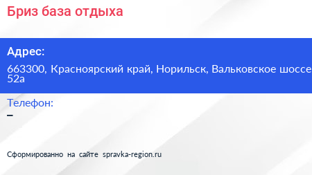 Бриз, база отдыха по адресу 663300, Красноярский край, Норильск, Вальковское шоссе, 52а в дальнейшем Организация, размещена в следующих категориях: