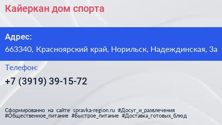 Кайеркан, дом спорта по адресу 663340, Красноярский край, Норильск, Надеждинская, 3а в дальнейшем Организация, размещена в следующих категориях:
