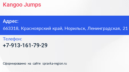 Kangoo Jumps по адресу 663318, Красноярский край, Норильск, Ленинградская, 21 в дальнейшем Организация, размещена в следующих категориях: