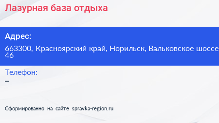 Лазурная, база отдыха по адресу 663300, Красноярский край, Норильск, Вальковское шоссе, 46 в дальнейшем Организация, размещена в следующих категориях: