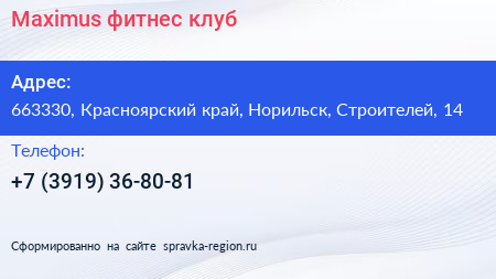 Maximus, фитнес-клуб по адресу 663330, Красноярский край, Норильск, Строителей, 14 в дальнейшем Организация, размещена в следующих категориях: