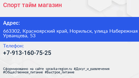 Спорт-тайм, магазин по адресу 663302, Красноярский край, Норильск, улица Набережная Урванцева, 53 в дальнейшем Организация, размещена в следующих категориях: