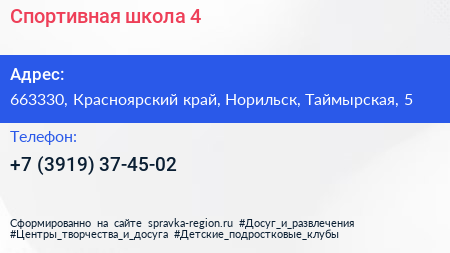 Спортивная школа №4 по адресу 663330, Красноярский край, Норильск, Таймырская, 5 в дальнейшем Организация, размещена в следующих категориях: