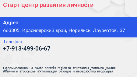 Старт, центр развития личности по адресу 663305, Красноярский край, Норильск, Лауреатов, 37 в дальнейшем Организация, размещена в следующих категориях: