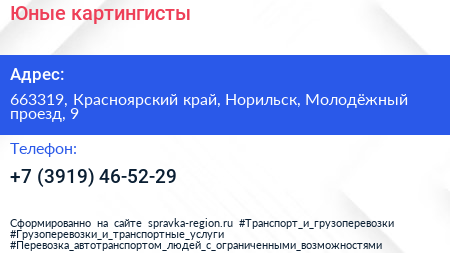 Юные картингисты по адресу 663319, Красноярский край, Норильск, Молодёжный проезд, 9 в дальнейшем Организация, размещена в следующих категориях: