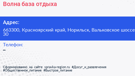 Волна, база отдыха по адресу 663300, Красноярский край, Норильск, Вальковское шоссе, 30 в дальнейшем Организация, размещена в следующих категориях: