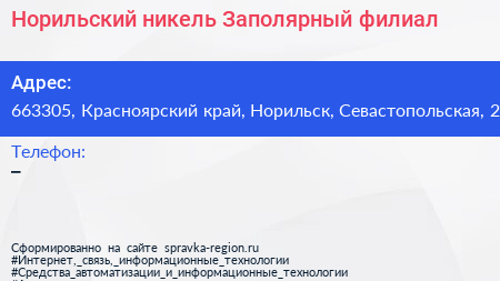 Норильский никель, Заполярный филиал по адресу 663305, Красноярский край, Норильск, Севастопольская, 2 в дальнейшем Организация, размещена в следующих категориях: