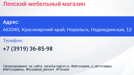Ленский, мебельный магазин по адресу 663340, Красноярский край, Норильск, Надеждинская, 12 в дальнейшем Организация, размещена в следующих категориях: