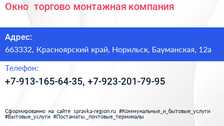 Окно+, торгово-монтажная компания по адресу 663332, Красноярский край, Норильск, Бауманская, 12а в дальнейшем Организация, размещена в следующих категориях: