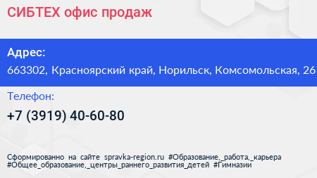 СИБТЕХ, офис продаж по адресу 663302, Красноярский край, Норильск, Комсомольская, 26 в дальнейшем Организация, размещена в следующих категориях: