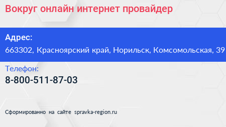Вокруг онлайн, интернет-провайдер по адресу 663302, Красноярский край, Норильск, Комсомольская, 39 в дальнейшем Организация, размещена в следующих категориях: