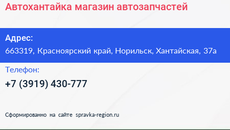 Автохантайка, магазин автозапчастей по адресу 663319, Красноярский край, Норильск, Хантайская, 37а в дальнейшем Организация, размещена в следующих категориях: