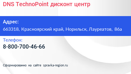 DNS TechnoPoint, дисконт-центр по адресу 663318, Красноярский край, Норильск, Лауреатов, 86а в дальнейшем Организация, размещена в следующих категориях: