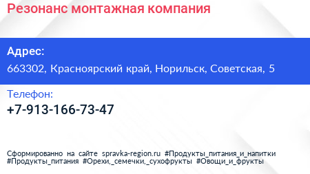 Резонанс, монтажная компания по адресу 663302, Красноярский край, Норильск, Советская, 5 в дальнейшем Организация, размещена в следующих категориях: