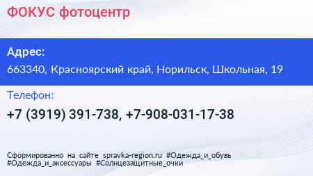 ФОКУС, фотоцентр по адресу 663340, Красноярский край, Норильск, Школьная, 19 в дальнейшем Организация, размещена в следующих категориях: