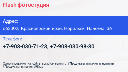 Flash, фотостудия по адресу 663302, Красноярский край, Норильск, Нансена, 36 в дальнейшем Организация, размещена в следующих категориях: