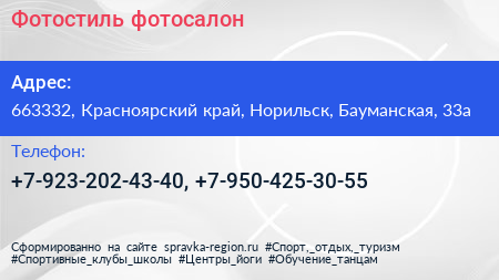 Фотостиль, фотосалон по адресу 663332, Красноярский край, Норильск, Бауманская, 33а в дальнейшем Организация, размещена в следующих категориях: