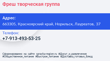Фреш, творческая группа по адресу 663305, Красноярский край, Норильск, Лауреатов, 37 в дальнейшем Организация, размещена в следующих категориях: