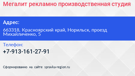 Мегалит, рекламно-производственная студия по адресу 663318, Красноярский край, Норильск, проезд Михайличенко, 5 в дальнейшем Организация, размещена в следующих категориях: