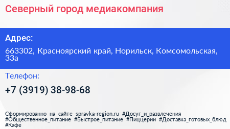 Северный город, медиакомпания по адресу 663302, Красноярский край, Норильск, Комсомольская, 33а в дальнейшем Организация, размещена в следующих категориях: