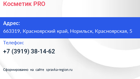 Косметик PRO по адресу 663319, Красноярский край, Норильск, Красноярская, 5 в дальнейшем Организация, размещена в следующих категориях: