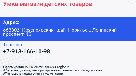 Умка, магазин детских товаров по адресу 663302, Красноярский край, Норильск, Ленинский проспект, 13 в дальнейшем Организация, размещена в следующих категориях: