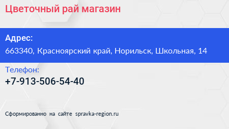 Цветочный рай, магазин по адресу 663340, Красноярский край, Норильск, Школьная, 14 в дальнейшем Организация, размещена в следующих категориях: