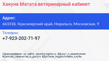 Хакуна Матата, ветеринарный кабинет по адресу 663318, Красноярский край, Норильск, Московская, 9 в дальнейшем Организация, размещена в следующих категориях: