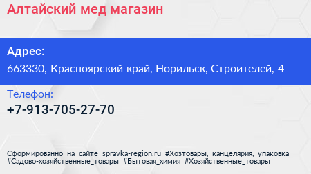 Алтайский мед, магазин по адресу 663330, Красноярский край, Норильск, Строителей, 4 в дальнейшем Организация, размещена в следующих категориях:
