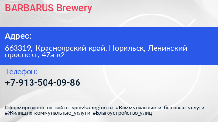 BARBARUS Brewery по адресу 663319, Красноярский край, Норильск, Ленинский проспект, 47а к2 в дальнейшем Организация, размещена в следующих категориях: