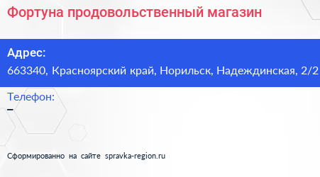 Фортуна, продовольственный магазин по адресу 663340, Красноярский край, Норильск, Надеждинская, 2/2 в дальнейшем Организация, размещена в следующих категориях: