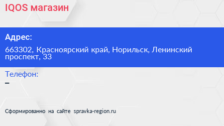 IQOS, магазин по адресу 663302, Красноярский край, Норильск, Ленинский проспект, 33 в дальнейшем Организация, размещена в следующих категориях: