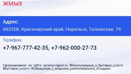 ЖМЫХ по адресу 663318, Красноярский край, Норильск, Талнахская, 74 в дальнейшем Организация, размещена в следующих категориях: