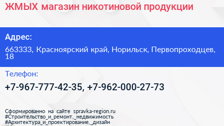 ЖМЫХ, магазин никотиновой продукции по адресу 663333, Красноярский край, Норильск, Первопроходцев, 18 в дальнейшем Организация, размещена в следующих категориях: