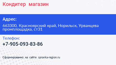 Кондитер+, магазин по адресу 663300, Красноярский край, Норильск, Урванцева промплощадка, ст31 в дальнейшем Организация, размещена в следующих категориях: