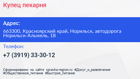 Купец, пекарня по адресу 663300, Красноярский край, Норильск, автодорога Норильск-Алыкель, 18 в дальнейшем Организация, размещена в следующих категориях: