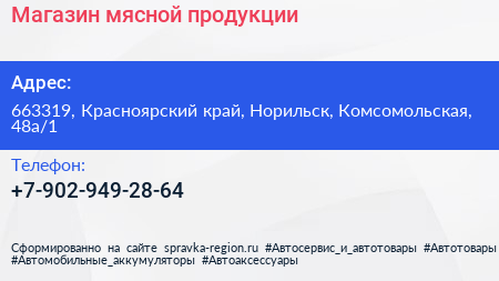 Магазин мясной продукции по адресу 663319, Красноярский край, Норильск, Комсомольская, 48а/1 в дальнейшем Организация, размещена в следующих категориях: