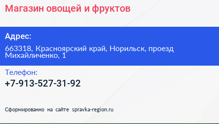 Магазин овощей и фруктов по адресу 663318, Красноярский край, Норильск, проезд Михайличенко, 1 в дальнейшем Организация, размещена в следующих категориях: