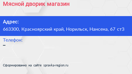 Мясной дворик, магазин по адресу 663300, Красноярский край, Норильск, Нансена, 67 ст3 в дальнейшем Организация, размещена в следующих категориях: