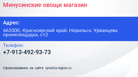 Минусинские овощи, магазин по адресу 663300, Красноярский край, Норильск, Урванцева промплощадка, ст2 в дальнейшем Организация, размещена в следующих категориях: