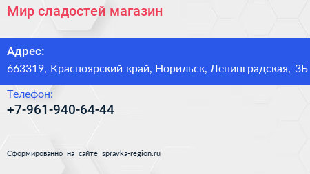 Мир сладостей, магазин по адресу 663319, Красноярский край, Норильск, Ленинградская, 3Б в дальнейшем Организация, размещена в следующих категориях: