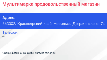 Мультимарка, продовольственный магазин по адресу 663302, Красноярский край, Норильск, Дзержинского, 7в в дальнейшем Организация, размещена в следующих категориях: