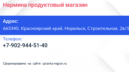 Нармина, продуктовый магазин по адресу 663340, Красноярский край, Норильск, Строительная, 2в/1 в дальнейшем Организация, размещена в следующих категориях: