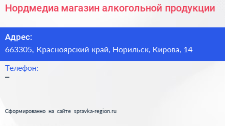 Нордмедиа, магазин алкогольной продукции по адресу 663305, Красноярский край, Норильск, Кирова, 14 в дальнейшем Организация, размещена в следующих категориях: