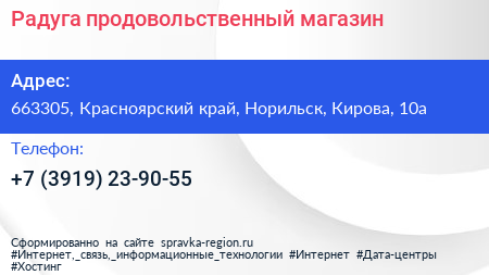 Радуга, продовольственный магазин по адресу 663305, Красноярский край, Норильск, Кирова, 10а в дальнейшем Организация, размещена в следующих категориях: