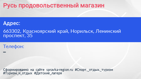 Русь, продовольственный магазин по адресу 663302, Красноярский край, Норильск, Ленинский проспект, 35 в дальнейшем Организация, размещена в следующих категориях:
