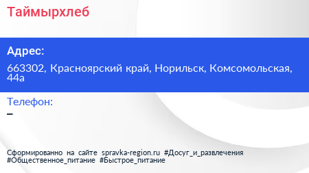 Таймырхлеб по адресу 663302, Красноярский край, Норильск, Комсомольская, 44а в дальнейшем Организация, размещена в следующих категориях:
